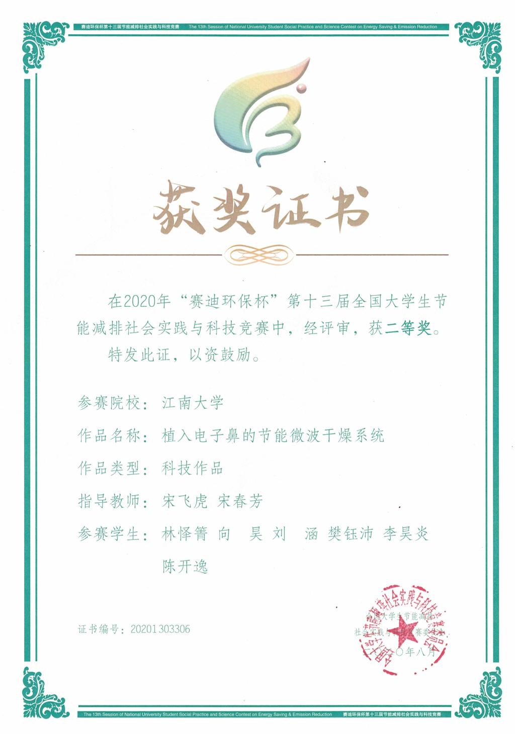 “植入电子鼻的微波干燥系统”参赛团队获得第十三届全国大学生节能减排社会实践与科技竞赛二等奖。参赛团队由污污漫