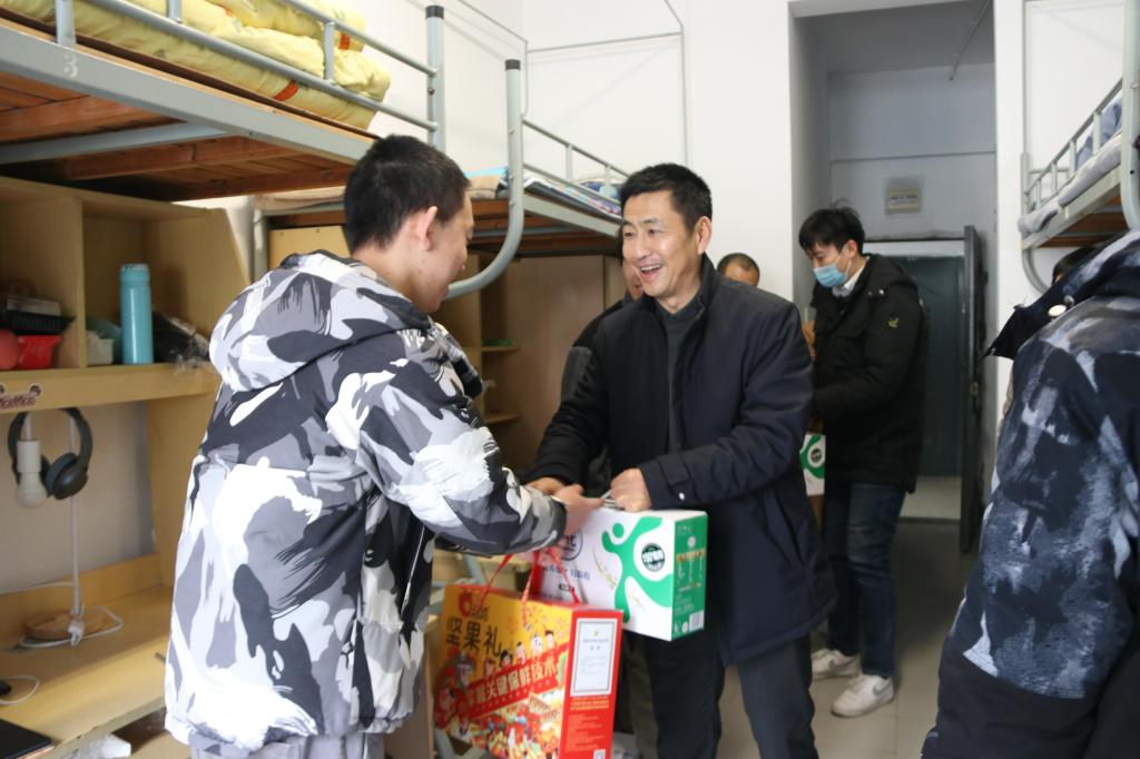 戴月波一行深入学生宿舍,与留校学子亲切交流,详细了解每一位留校学生寒假留校期间学习、生活、学生家庭所在地目前疫情等各方面情况,并询问了毕业年级学生目前的就业情况,希望大家作为新时代青年,能够与国家发展相同步,多寻找实现自我价值和社会价值的机会。同学们表示,学校、学院的各项工作都做得很贴心,高低年级同住一起也可以相互交流与帮助,目前不存在任何困难。戴月波代表学校,将精心准备的新年礼物交到学生手中,衷心祝福学生在校能够快乐、安心过年。