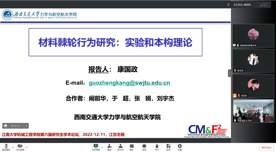 开幕式结束后,开始线上加线下特邀专家学术报告会,上海交通大学谷国迎教授作题为“软体机器人技术研究进展”的学术报告,华中科技大学廖广兰教授作题为“芯片封装缺陷检测技术”的学术报告。11日上午,在机械楼C302举行了第二场线上加线下特邀专家学术报告会,西南交通大学康国政教授作题为“材料棘轮行为研究:实验和本构理论”的学术报告,北京理工大学胡更开教授作题为“声波/弹性波超材料:概念、性质与应用”的学术报告。