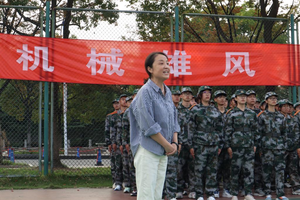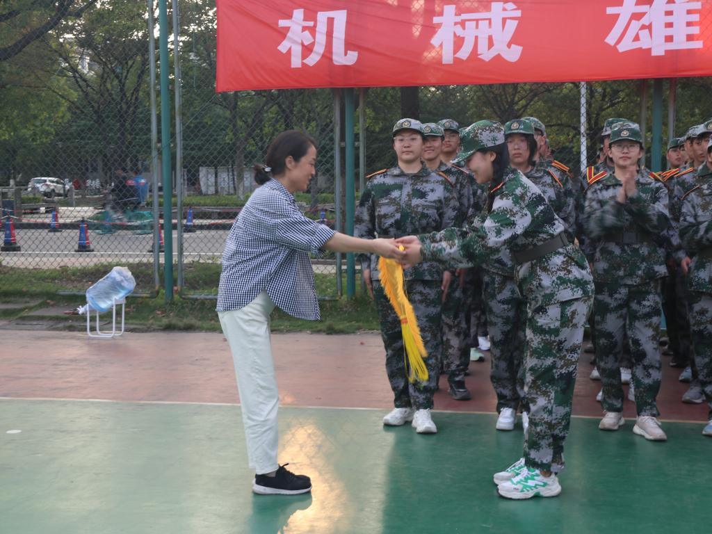 在教官的引领下,参训学生展示了近日训练的成果。整齐的队列、铿锵的步伐和响亮的口号展现了机械学子的军训成效与精神风貌。高雪梅为优秀军训排授旗并讲话,她对承训教官的辛苦付出致以崇高的敬意和诚挚的感谢,对污污漫