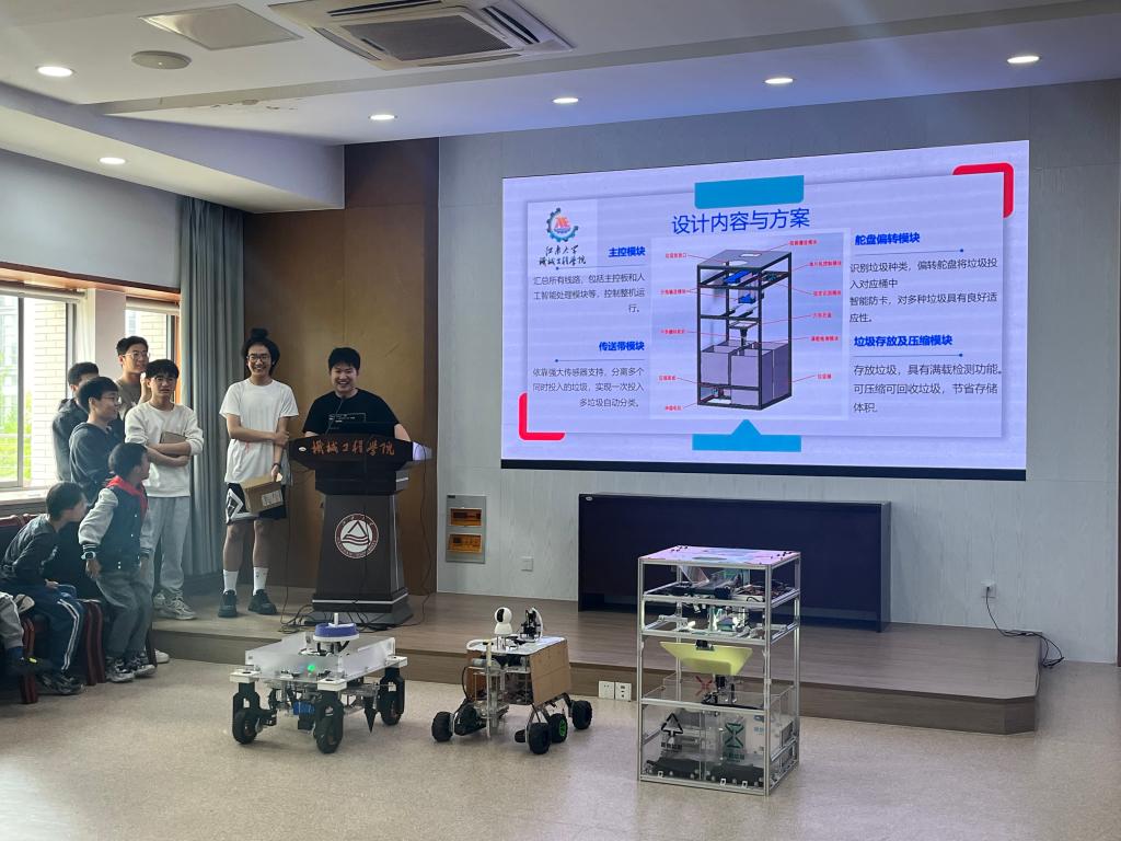 本次活动由刚在全省机械创新设计大赛中获奖的本科生担任主讲。“智能分类机器人”的团队成员毛耀增和郭兰鑫同学为小朋友们展示智能分类机器人。小朋友们将废弃物品投入机器,通过智能识别模块便可实现垃圾的自动分类回收,“太神奇啦!”现场小朋友们纷纷发出惊叹。