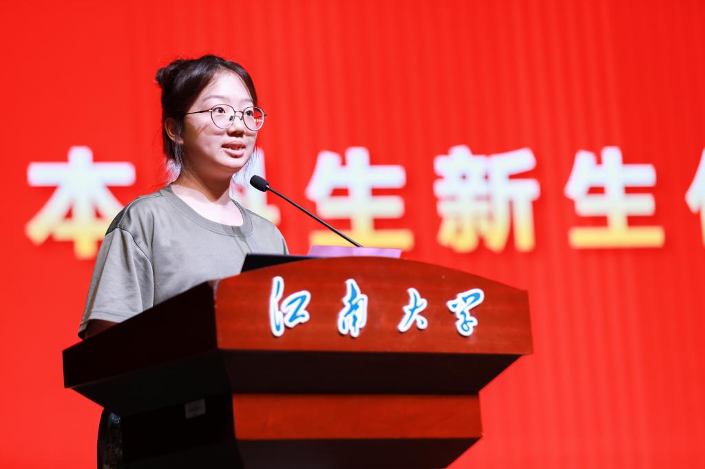 学生代表发言环节,2022级博士研究生王飞杰分享科研心得,倡导“脚踏实地”的科研态度、“勇于创新”的交叉思维和“服务家国”的大我情怀,勉励新生扎实走好科研每一步,用扎实的科研成果服务国家发展战略。2025级硕士研究生朱国霖和本科生宗琦景代表新生表态,将秉承“笃学尚行,止于至善”的校训和“厚德求实,博学践行”的院训,于江南沃土上成长、成人、成才。