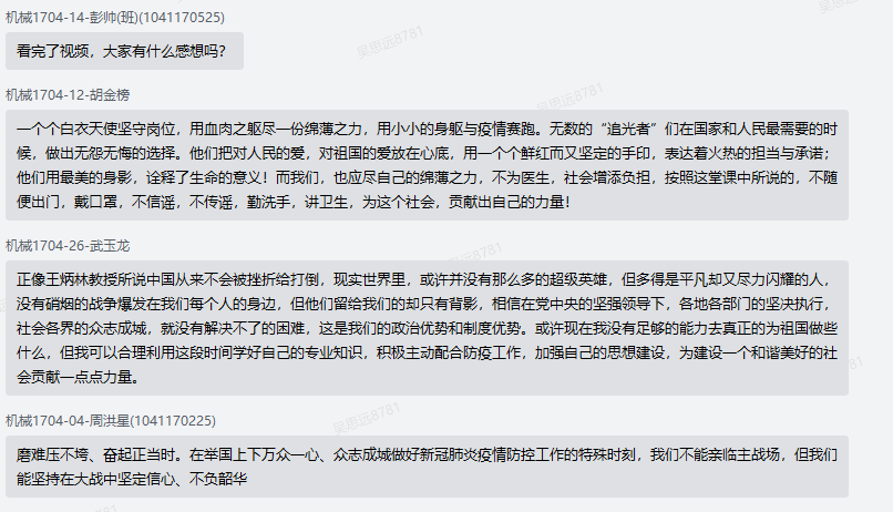 1600余名师生1600余份感想,均少不了对前线医护人员和志愿者们付出的感谢,对取得这场防疫攻坚战胜利渴望。作为当代青年,在追求中华民族伟大复兴的中国梦的道路上,更需提高自身的忧患意识、危机意识,做一个有理想、有道德、有本领、有担当的新时代青年,为中国的强大奋斗不息、努力不止!
