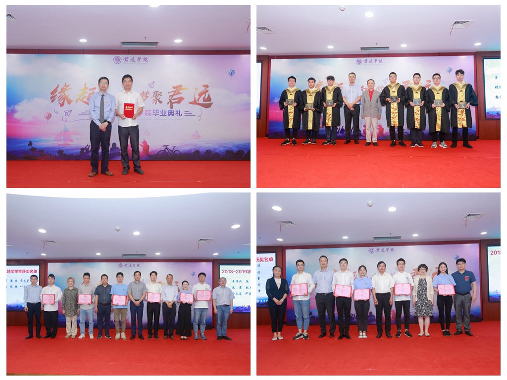 为鼓励君远师生在工作和学习中锐意进取,奋发努力,学院评选出2018-2019学年君远学院卓越奖学金12人,单项奖26人和2019年君远优秀奖两名。张凌浩副校长、赵俊明副部长、朱飞主任、张梁主任、徐学明处长、黄敏处长等与会嘉宾为获奖师生颁发证书,并合影留念。
