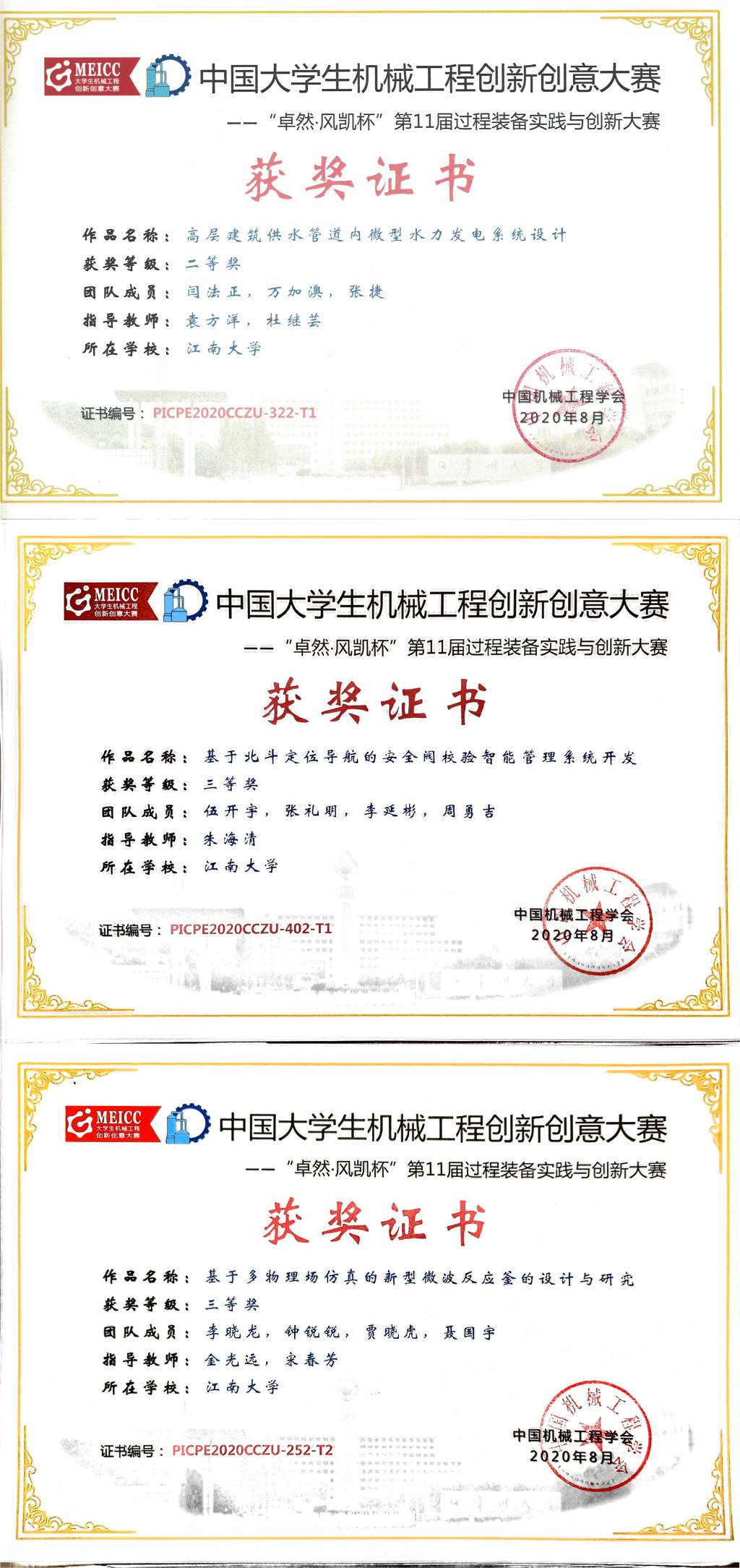 袁方洋、杜继芸老师指导课题“高层建筑供水管道内微型水力发电系统设计”获得了“卓然·风凯杯”第十一届过程装备实践与创新大赛二等奖,参赛学生:闫法正、万加澳、张捷;金光远、宋春芳指导课题“基于多物理场仿真的新型微波反应釜的设计与研究”获得了三等奖,参赛学生:李晓龙、钟锐锐、贾晓虎、聂国宇;朱海清指导课题“基于北斗定位导航的安全阀校验智能管理系统开发”获得了三等奖,参赛学生:伍开宇、张礼明、李延彬、周勇吉。