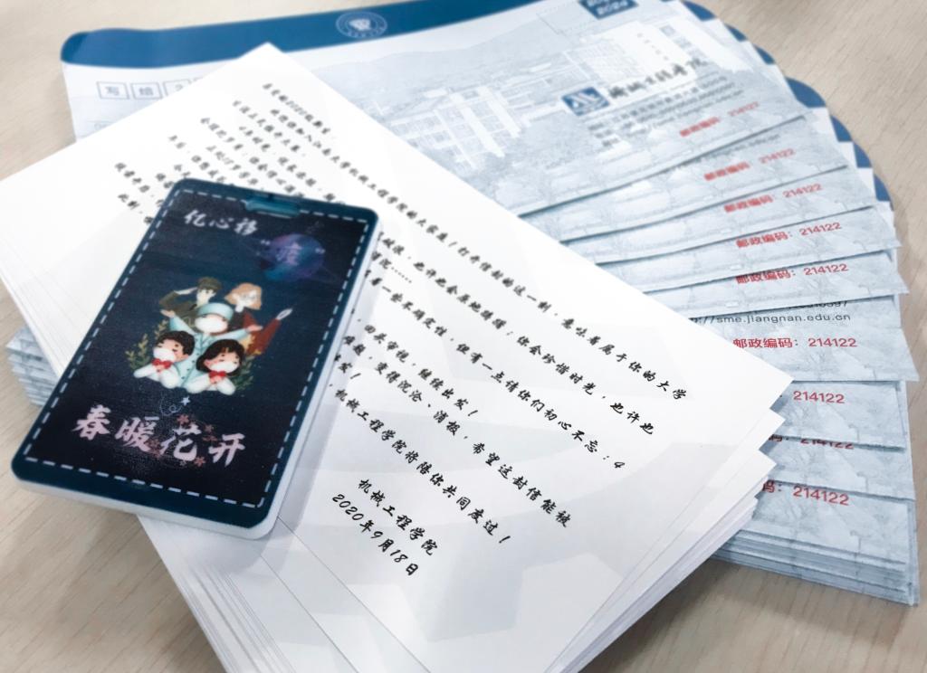 天高云淡,金风送爽。9月18日,布置一新的江南大学机械工程学院迎来了2020级本科新生。为增加新生入学仪式感,学院给每位新生准备了特殊礼物。结合疫情和学校防控需要,学院特别定制防疫提示卡套,期待“亿心移疫 春暖花开”,时刻提醒学生做好个人防护措施;暖心温情、设计精美的“写给2024的一封信”,提醒新生不忘初心、砥砺前行。