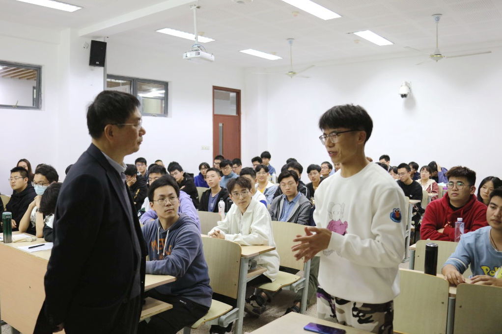 期间,田备不时与学生互动。关荣同学通过他当防疫志愿者时的亲身经历告诉同学中国制度的优越性,为作为一名中国公民而自豪;李聪同学讲述了他看到一台台生产口罩的机械设备和麻省理工研发的低成本呼吸机为抗击疫情所做的贡献,感受到机械专业对社会的重要性;彭笑峰同学通过分享自身的学习情况、讲述受疫情冲击的企业自救事例、国家经济复苏的有关政策,认为“中国政策”必将走向胜利。随后,田备指出夺取抗疫全面胜利并不简单,这需要我们持续努力,抓好学校疫情防控常态化工作,学习弘扬践行抗疫精神。真正做到未雨绸缪,全方位自我赋能。课堂尾声,同学们提出一些关于学习、就业和发展方向的问题,田备都耐心解答,字字珠玑引发学生强烈共鸣与深刻思考。最后,田备对学生提出了殷切期盼,希望他们能够传承抗疫精神,把握青春、尊重青春、成长为社会栋梁之才。