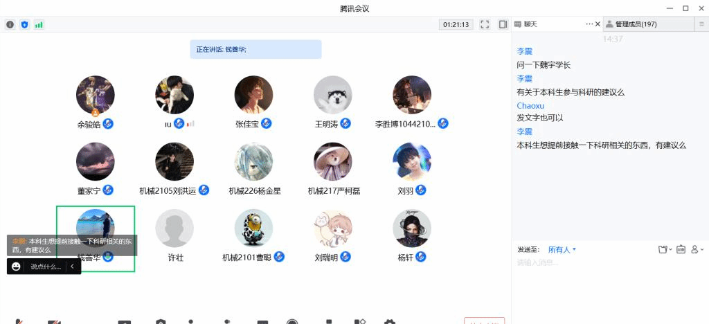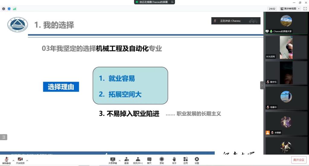 钱善华以播放机械工程学院宣传视频开场,向学生介绍了学院本硕博一体化的人才培养体系。史朝旭以“制造即育人”为题,分享其从事机械行业的心得体会:产业升级需要更多技术型制造人才、成功需要知识和实践的双重加持,寄望学生们做好职业规划。魏宇以“学在机械”为主题,分享了他大学期间的课程学习、学科竞赛、读研规划、毕业设计等方面的心得,通过讲述了他大学生创新训练项目日夜奋斗钻研最终发表高水平论文的经历寄语学生珍惜校园时光、做好学业规划、培养自主能力。