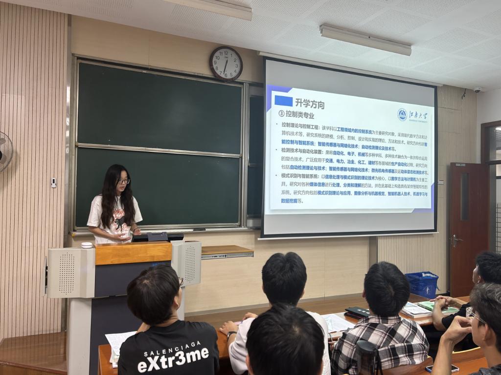 史璐芸从“过程装备与控制工程专业是什么”切入,从专业发展、课程体系、培养目标三个方面,引导同学们探索学科专业前景及发展方向。她对同学们说“学过程装备与控制工程的,比学化工的多懂些机械,比学机械的多懂些控制,比学控制的多懂些工艺”,也鼓励同学们要抓住自身专业优势,夯实专业基础,丰富知识储备的基础上精准定位自己的兴趣点,并提前关注和规划后续深造的领域,尽早进入实验室开展研究。