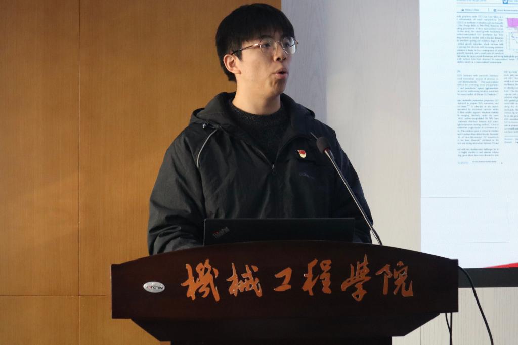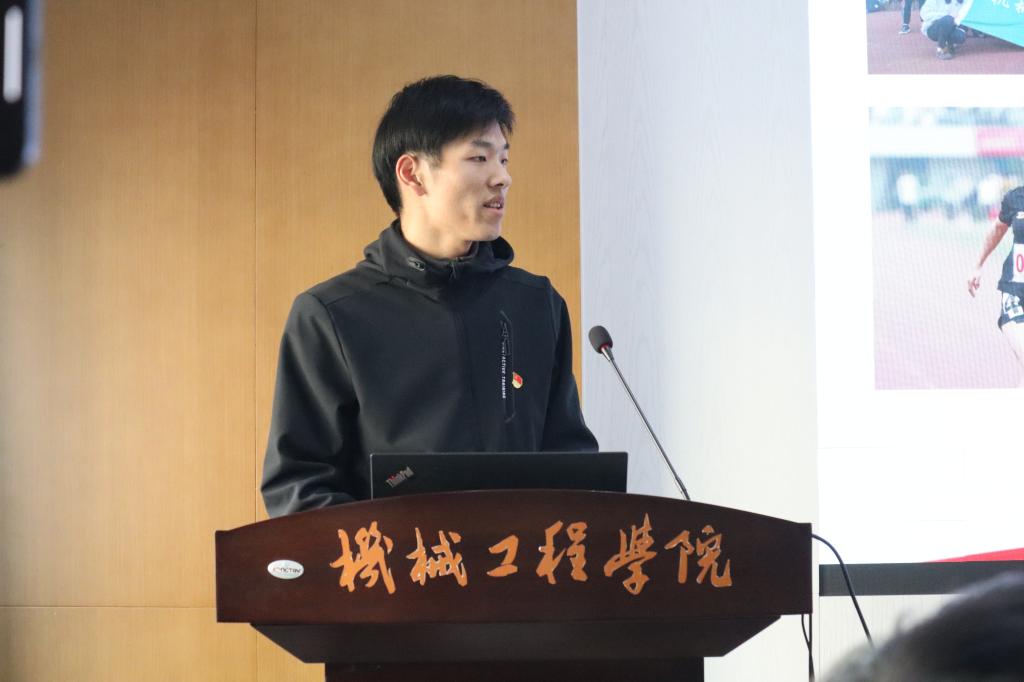 支部叶鹏、王鹏飞、彭鑫三位同学结合自身成长依次分享了对“智创时代机械学子应当如何作为”的思考。叶鹏本硕就读于江南大学,本科期间参与工程实践与创新能力大赛获全国银奖。他从精益求精在竞赛实践中寻求突破的经历讲起,分享了从本科到研究生的身份转变与适应过渡,鼓励大家以平常心面对生活中的各种困难与瓶颈,不退缩、敢担当,以积极心态突破自己,成长成才。王鹏飞荣获2022-2023年度国家奖学金,是一名全面发展的机械体育人,本硕期间共斩获校运会金牌11枚。他分享了“无体育,不机械”的成长故事,讲述了机械田径队从低谷到壮大再到突破的历程。他认为体育对机械学子意义重大,不仅体现在强健体魄,更体现在磨练意志、坚定目标、敢打敢拼、团队配合的体育精神,鼓励大家成为有韧性的机械青年。彭鑫硕士期间发表论文两篇,授权发明专利一项,参与国家自然科学基金等项目,现已签约远景能源,投身新能源风电行业。他介绍了自己的研究方向,分享了自己在科研与就业中立足国家需求、投身智能制造的选择。他认为青年成长中最重要的是锻炼发现问题、分析问题、解决问题的能力,以及着眼国家需要、将个人成长融入社会发展全局的担当。