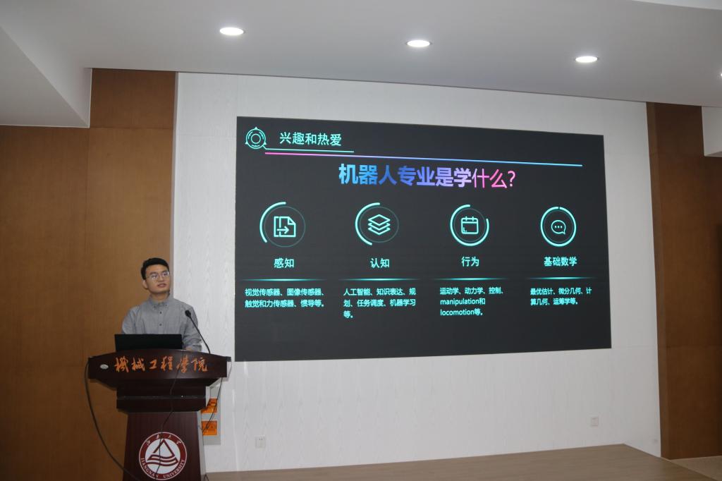 科创竞赛板块由机电检测与研究中心研究生党支部书记姚宇等4名同学主讲,他们结合自身丰富竞赛经验,为新生清晰梳理专业竞赛名录,理清思路,激发科创热情。其中,姚宇以自己参与Robocon机器人大赛的经历为基础,与机器人工程专业的新生分享了参与竞赛的收获与意义,并为新生描画了机器人工程师的成长进阶道路,帮助新生清晰未来方向。