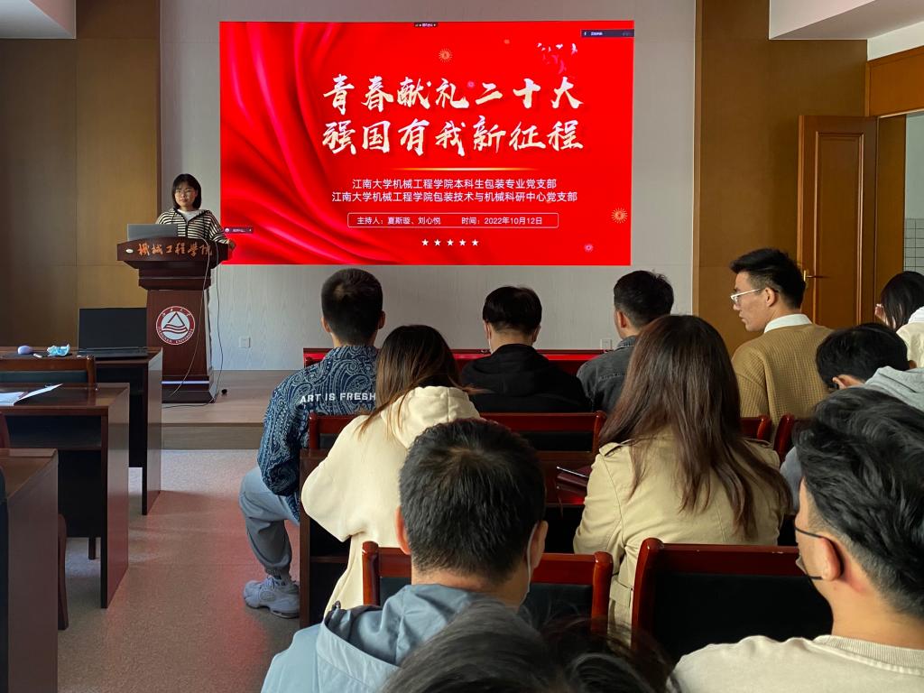 为迎接党的二十大胜利召开,10月12日上午,机械工程学院包装技术与机械科研中心党支部、本科生包装工程专业党支部在机械楼C302会议室,采用线上线下相结合的方式联合开展“青春献礼二十大,强国有我新征程”组织生活会,指导教师张倩瑶、全体党支部成员参加会议。本次会议由本科生包装工程专业党支部书记夏斯璇主持。