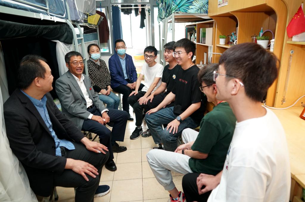 陈卫首先对宿舍7名同学全员升学表达了祝贺,他从课程与专业、个人与集体、当下与未来等几个方面与学生们进行了深入交流,并征求听取了同学们对学校人才培养和建设发展的意见建议。走访中,围绕同学们所在君远学院的培养模式和课程设置,陈卫表示,君远学院是学校培养高素质创新型人才的一种创新和探索,相关成果曾获得国家级教学成果奖一等奖,其人才培养是经过实践检验卓有成效的一种培养模式。他指出,学生的主业是学习,宿舍同学能够全员成功升学是集体一起努力奋斗的结果,希望大家能够多与学弟学妹分享奋斗经验,将这种优秀传承下去,让优秀成为一种习惯;同时期望大家能够再接再厉,再攀高峰。