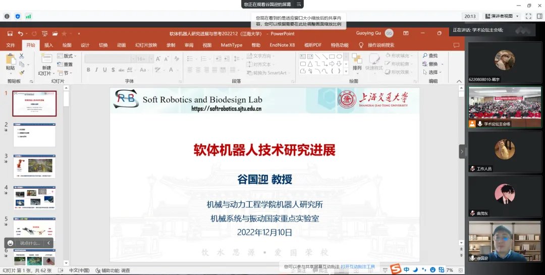 开幕式结束后,开始线上加线下特邀专家学术报告会,上海交通大学谷国迎教授作题为“软体机器人技术研究进展”的学术报告,华中科技大学廖广兰教授作题为“芯片封装缺陷检测技术”的学术报告。11日上午,在机械楼C302举行了第二场线上加线下特邀专家学术报告会,西南交通大学康国政教授作题为“材料棘轮行为研究:实验和本构理论”的学术报告,北京理工大学胡更开教授作题为“声波/弹性波超材料:概念、性质与应用”的学术报告。
