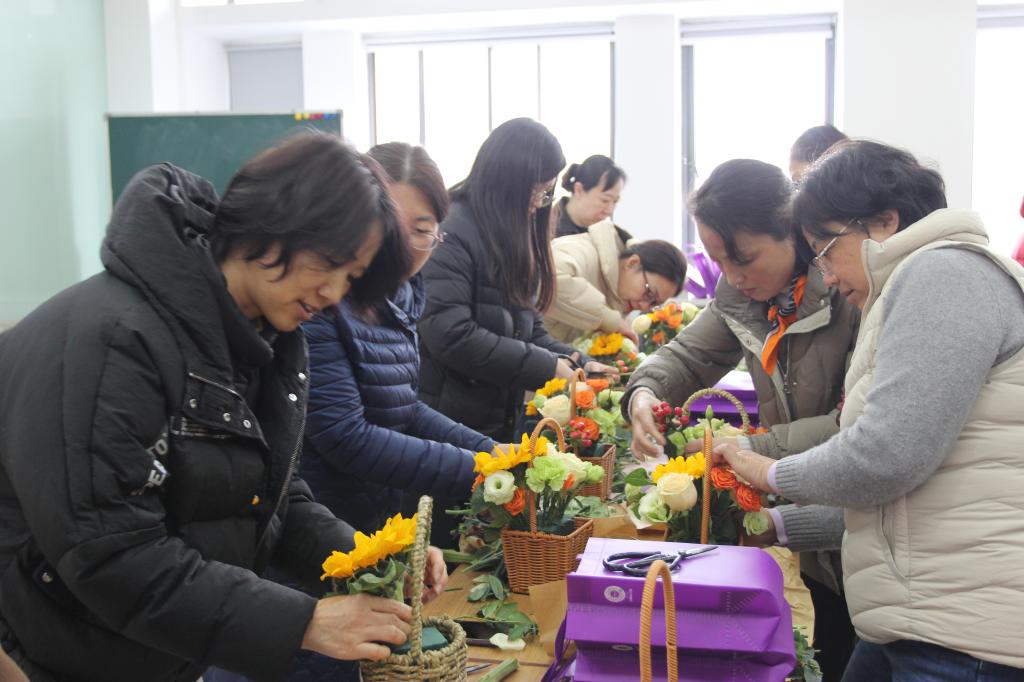 活动现场,花朵娇艳,芳香四溢,老师们热情高涨,踊跃参与。花艺讲师演示方法及技巧后,女教工们开始自己动手创意插花,在愉快的氛围中女教工们装扮属于自己的“女神花篮”,大家脸上洋溢着满满的幸福感和成就感,心中承载着对未来美好生活的向往和祝福,不但亲手体验插花的乐趣,也感受到浓浓的幸福,活动结束后,大家纷纷表示此次活动形式新颖,体验好,有意义。
