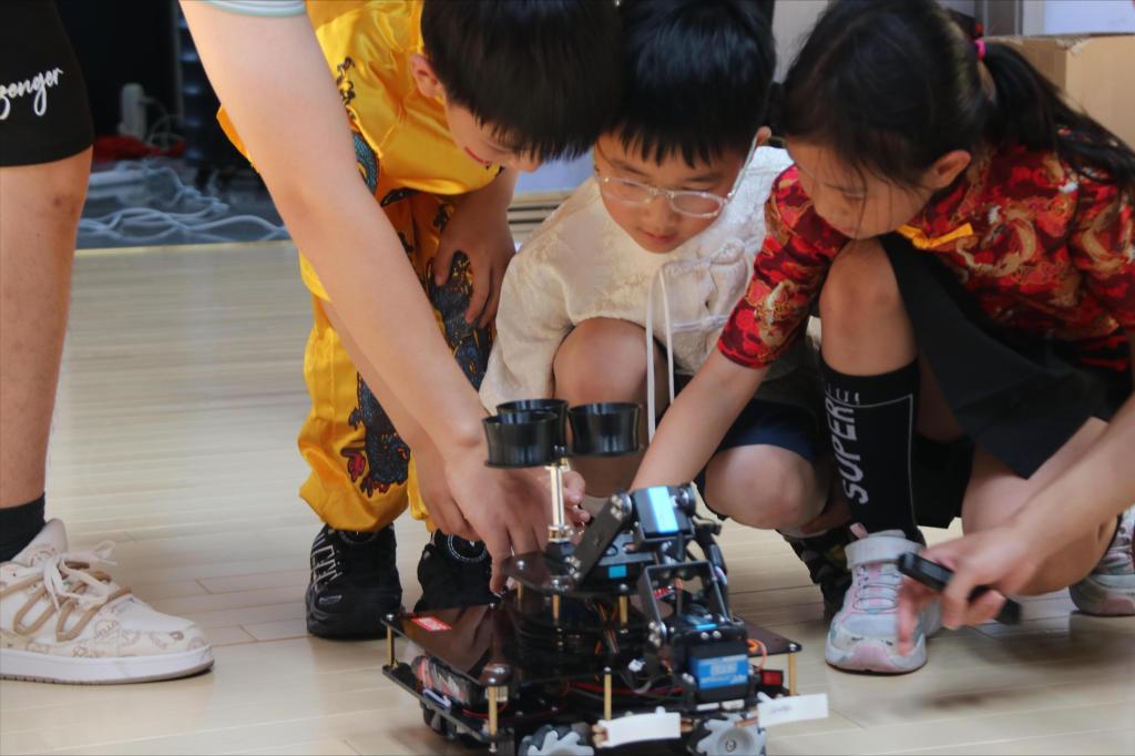 作品展示环节,主讲人生动地为小朋友们讲解了机器人编程与简易机器人设计的原理,机甲大师灵活跟随、物流机器人高效投放、采椒机器人精准采摘,小朋友们在互动环节争先举手回答问题,现场氛围十分热烈。科普实验环节,主讲人首先带来“小苏打遇到白醋”的化学实验。小苏打中的碳酸氢钠和白醋中的醋酸产生化学反应,产生二氧化碳,使气球鼓起来。小朋友们直呼“太神奇了”。主讲人通过单机小马达实验向大家揭秘了电与磁的奥秘。现场设置了隔空击物比拼,使小朋友们动手体验到“空气炮”中蕴含的有趣的伯努利原理。太阳能小车实验环节,小朋友们在志愿者的协助下亲自动手组装,在实践中学习到了太阳能的工作原理和应用价值。小朋友们在科普实验环节不仅收获了科学知识,更感受到了科学探索的乐趣。