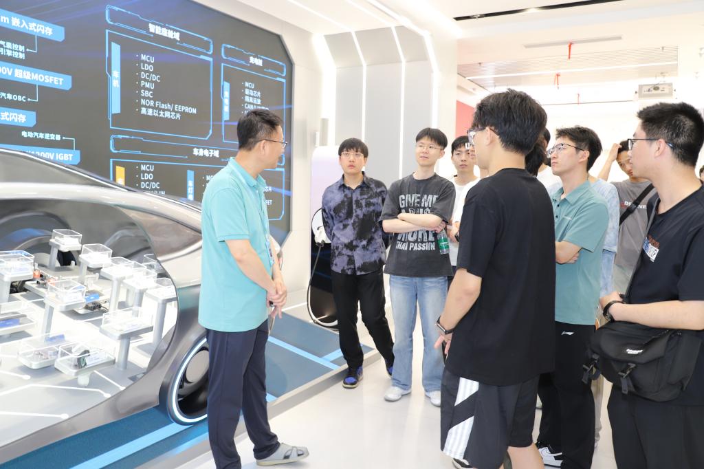 华虹半导体(无锡)有限公司是全球领先的特色工艺纯晶圆代工企业,秉持“8英寸+12英寸”、先进“特色IC + Power Discrete”的发展战略,专注于嵌入式/独立式非易失性存储器、功率器件、模拟与电源管理和逻辑与射频等特色工艺技术的持续创新,有力支持新能源汽车、绿色能源、物联网等新兴领域应用。走访期间,师生一行参观了企业展厅和FAB生产车间,工作人员全程细致讲解,从公司发展历程到芯片制造全流程,从技术研发到行业应用场景,丰富的图文、视频和实物展品生动展现了华虹人“知难而进、奋发图强”的“芯”路历程。在智能化生产车间,学生们实地观摩了芯片制造的高精度设备和自动化生产线,无尘车间内精密严谨的作业场景令大家深刻体悟到“大国智造”背后的工匠精神。