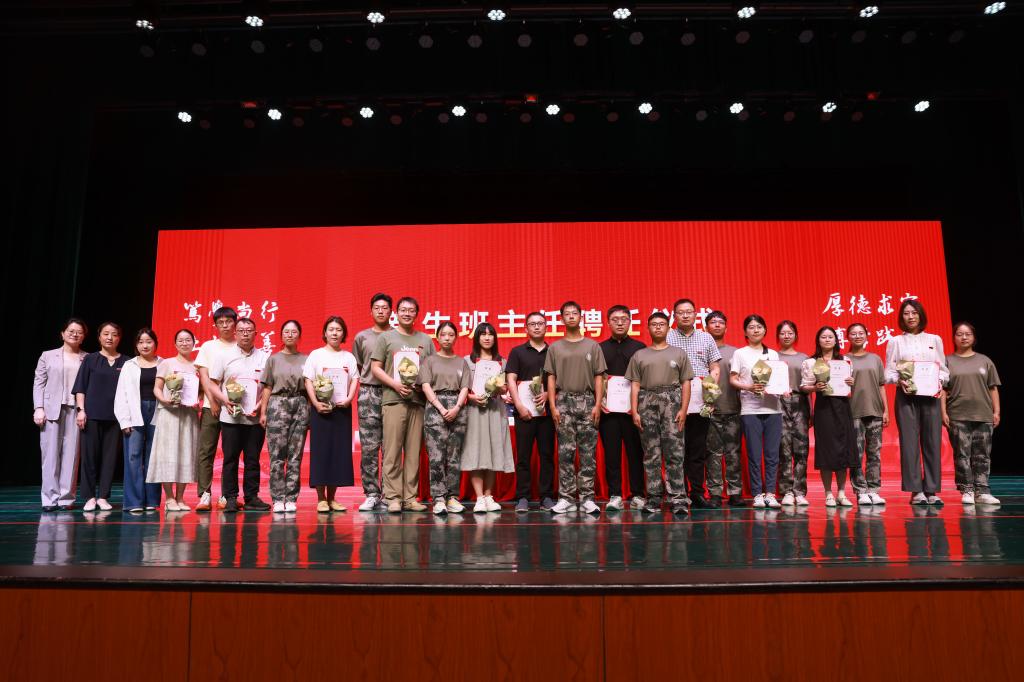 典礼期间举行了2025级新生班主任聘任仪式。党委书记高雪梅为班主任颁发聘书,学生代表向老师献花并合影留念。