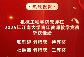 近日,江南大学第十四届青年教师教学竞赛落下帷幕,经过学院预赛、学校初赛和学校复赛等3个轮次的激烈角逐,全校共评选出特等奖4名、一等奖4名和二等奖8名。我院青年教师张雅婷和杜继芸凭借扎实的学科素养和突出的教学能力分别荣获特等奖和二等奖。