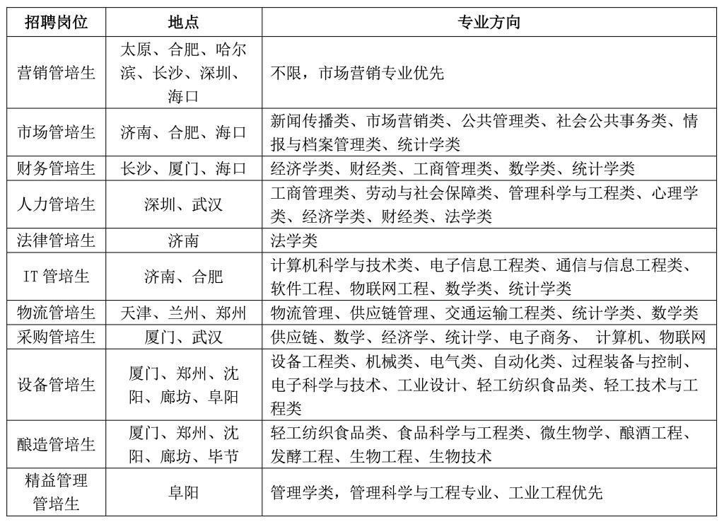 为建立完善的后备人才梯队,推动公司持续健康发展,实现年轻化、专业化、市场化、国际化的人才战略,华润啤酒管培生项目应运而生。管培生选拔主要面向优秀应届毕业生,通过体系化的培养,造就一批年轻有为、忠诚担当、德才兼备的中层管理人才后备队伍。